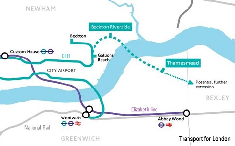 Transport for London’s plan shows the extension leaving the Beckton line just north of Gallions Reach, turning east through Beckton Riverside and then heading in a south-easterly direction under the Thames to Thamesmead. A extension beyond Thamesmead is also a possibility, which would take the line towards Erith.
